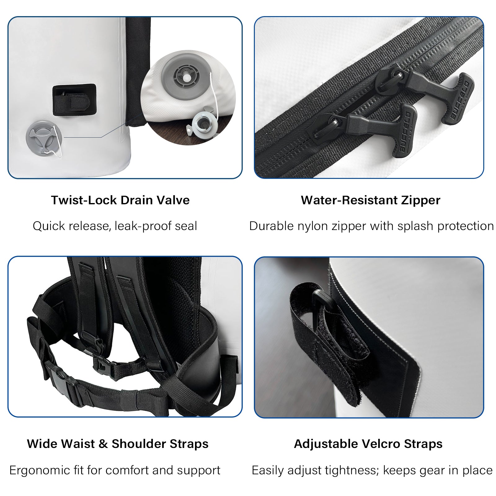 - Zipper: Water-repellent nylon zipper
